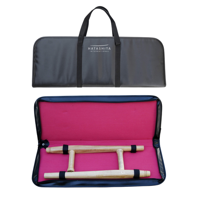 Hatashita Black vinyl tonfa case. Outer shell with red inner lining. Holds one pair of tonfa. Complete with carrying handles. Easy to wipe clean before and after use.